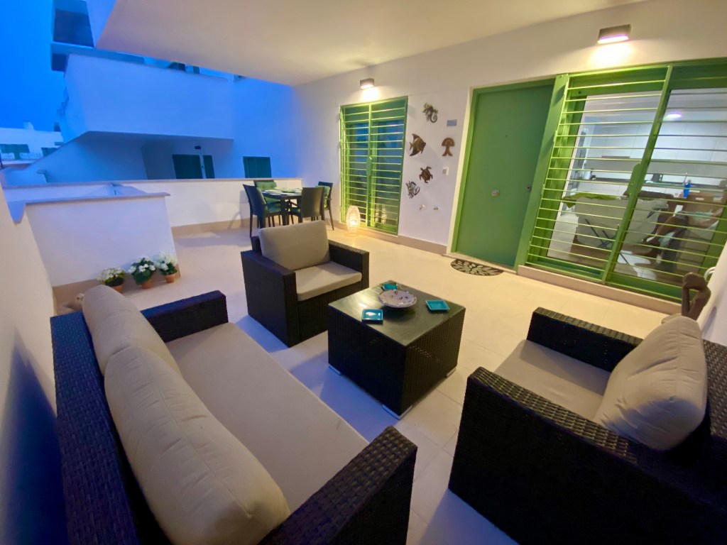 The large terrace enjoys plenty of privacy and shade from the hot sun. Relax with drinks on the sofa before enjoying al-fresco dining under the stars.